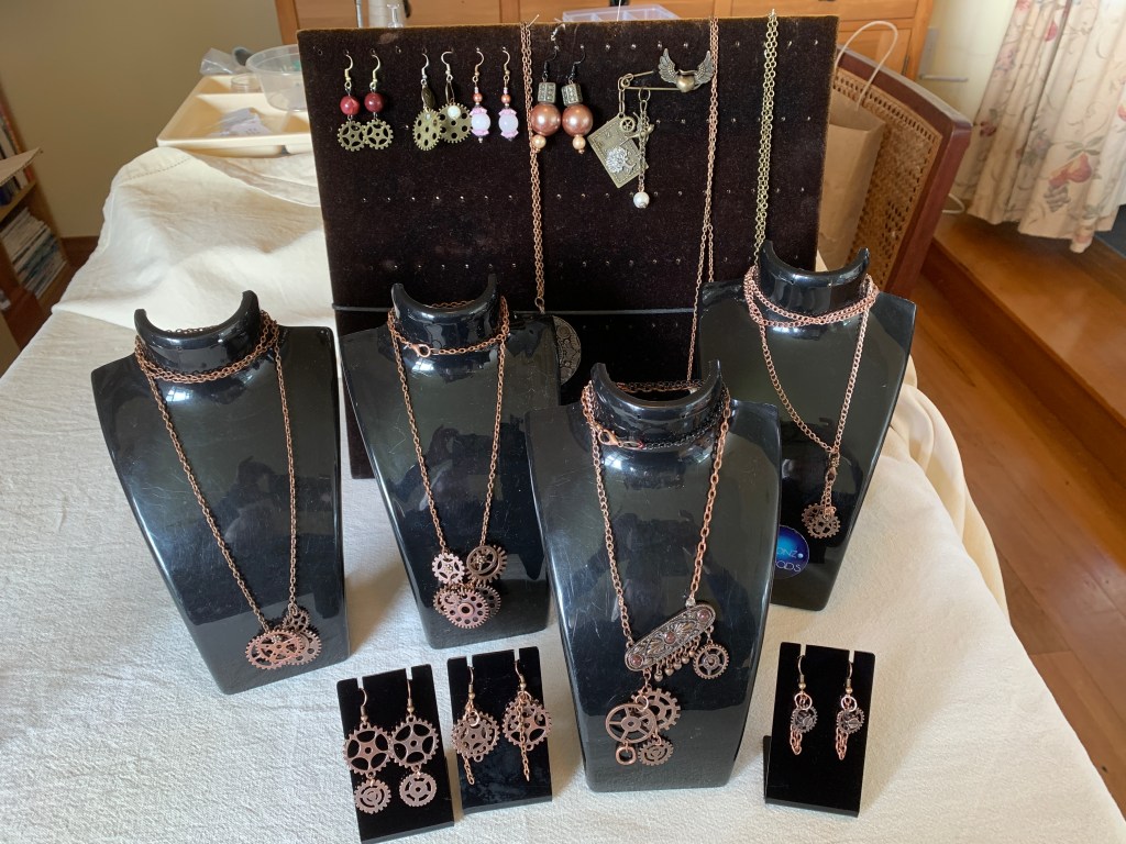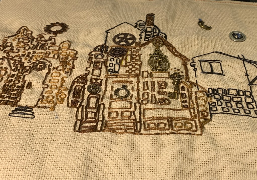 Happy with my recent stitched village projects (I might have to start a new range), and also recently making steampunk inspired jewellery, I thought I’d have a go at steampunk/Victorian houses. It’s taking a while and I’m waiting for some cottons that I had to buy online, but am happy with it so far.