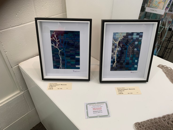 I’ve just won “Highly Commended” in the Craft section of Kāpiti Arts and Crafts Society Inc‘s annual awards, sponsored by Forsyth Barr. The award is for my diptych, “Memories of Blue (i) and (ii)”. These are two of five (so far) in my new Ghost Trees range.