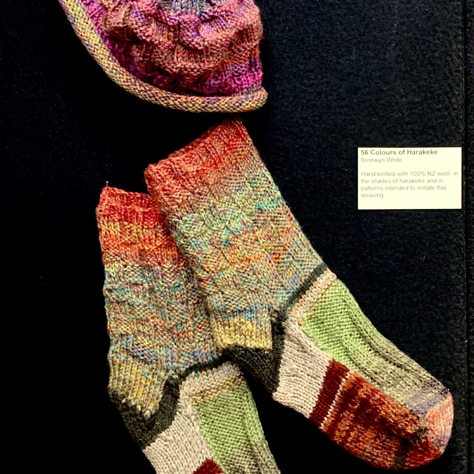 Images below, left to right: Top row: Pā Harakeke, entries on display, Harakeke Kōrari. Bottom row: detail of Harakeke Kōrari, Colours of Harakeke knitted hat and socks, detail of Pā Harakeke
