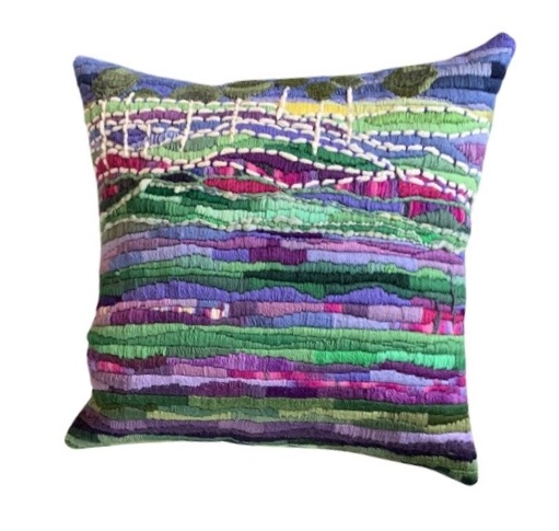 (July 2023) This cushion, “Sunshine on Fields of Gold”, has just been awarded the Crafts prize at the winners of Kāpiti Arts and Crafts Society’s annual Art and Craft Awards. Judged by Penny Eames and sponsored by Forsyth Barr, the Society awards prizes in both Art and Craft sections.
