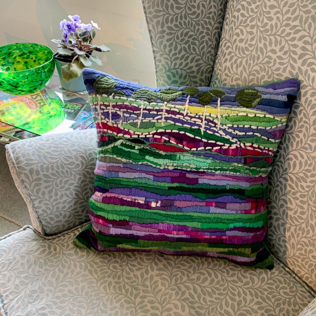 (August 2021) Cushions are taking up my time lately! Pleased with the results of my recent iris cushion with a leadlight effect, and my birch trees series (images below) I’m combining a couple of the effects in a new way: to create a not-quite-landscape with vertical lines intersecting the horizontal, patchwork-like stitching.