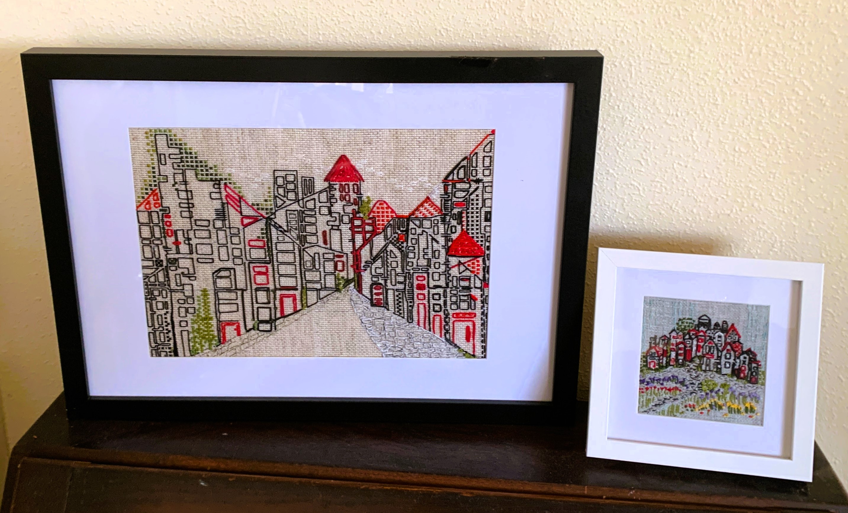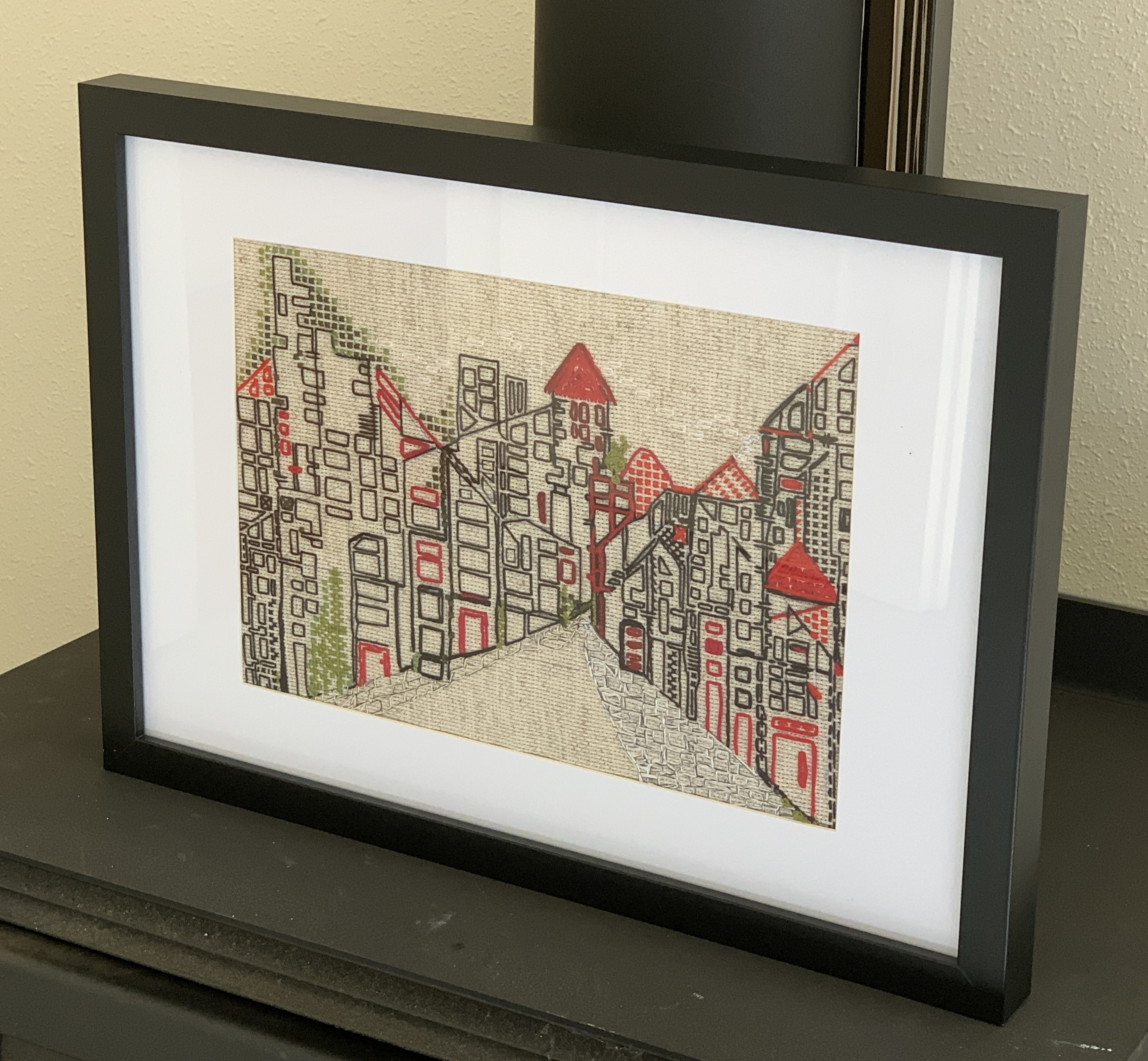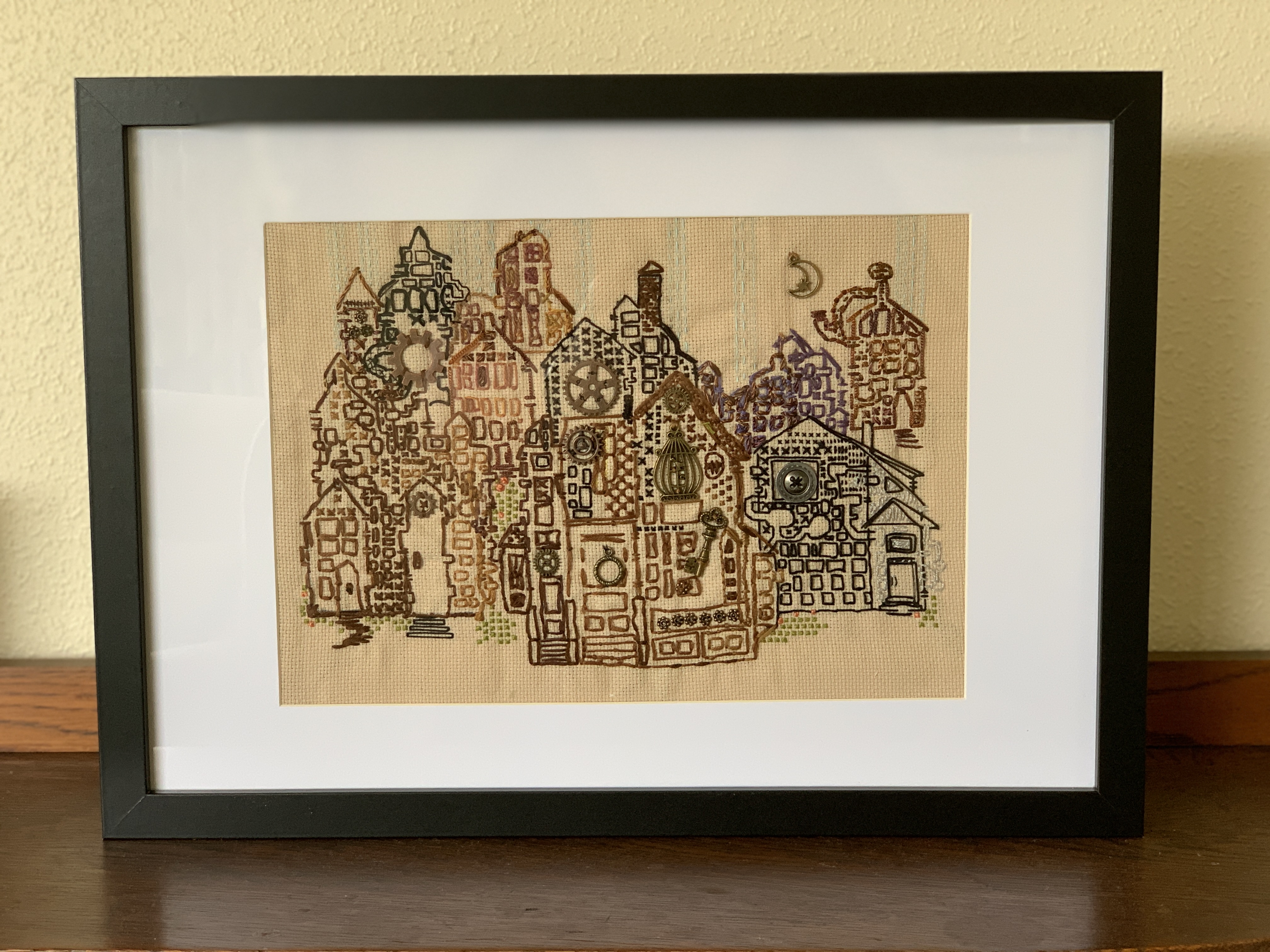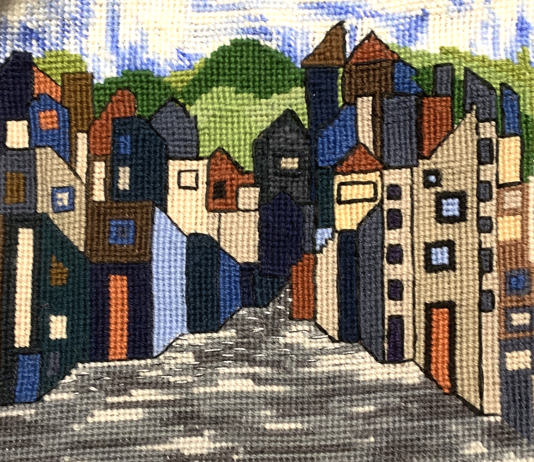 I’m also rather pleased with my quirky “Steampunk Village” using cogs and sprockets from my jewellery-making; it’s not for sale. “Terracotta and Blue Village” is a more traditional stitched tapestry, and I’ve finally finished and framed “Abstract City” which is stitched on tapestry fabric but with the canvas showing through. It features apartment buildings rather than village-style houses. Most of my stitched villages are tidy and symmetrical; I thought it would be fun to stitch a crooked village for a change, hence “Black and Purple Crooked Village”.