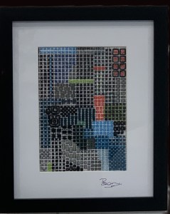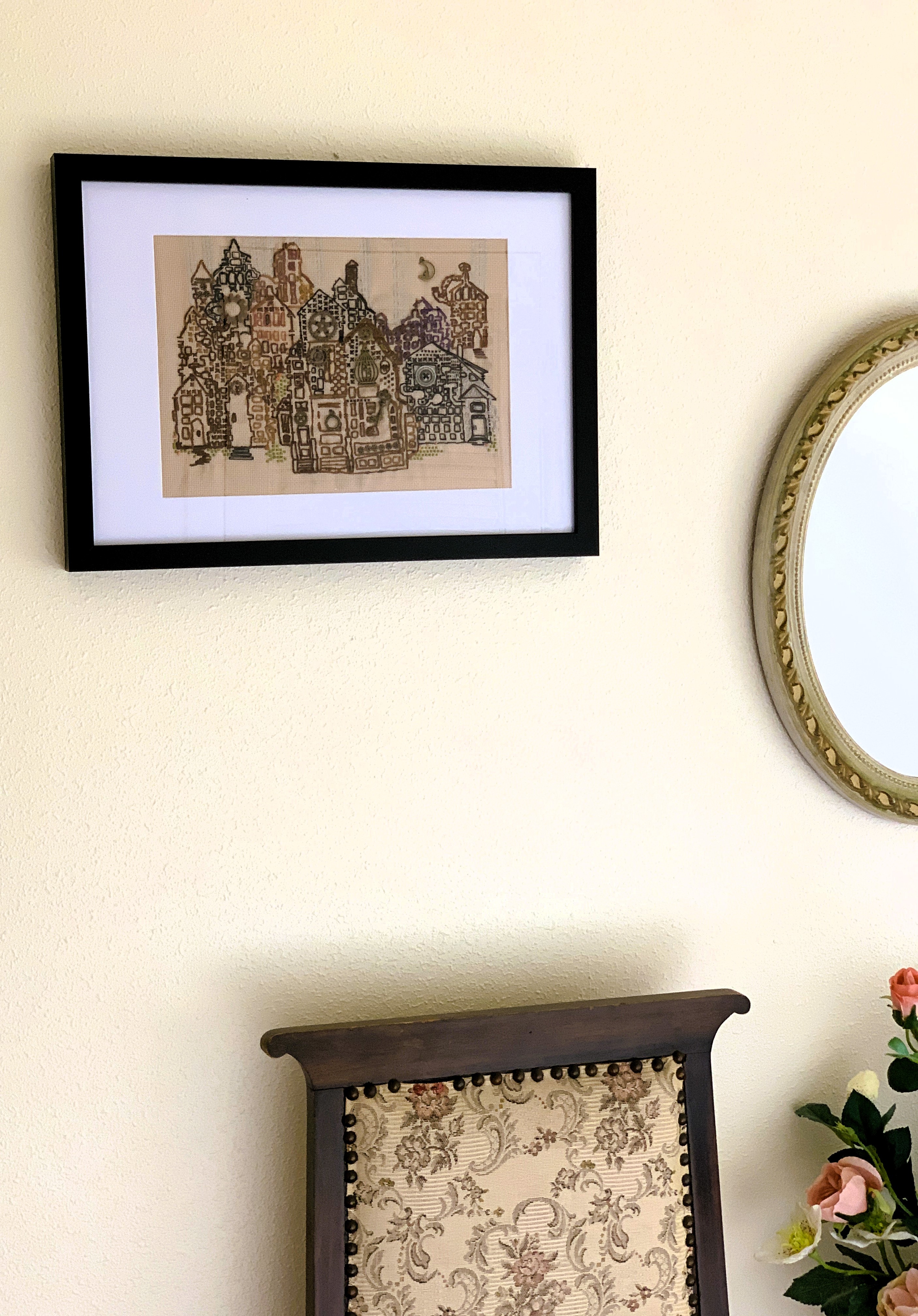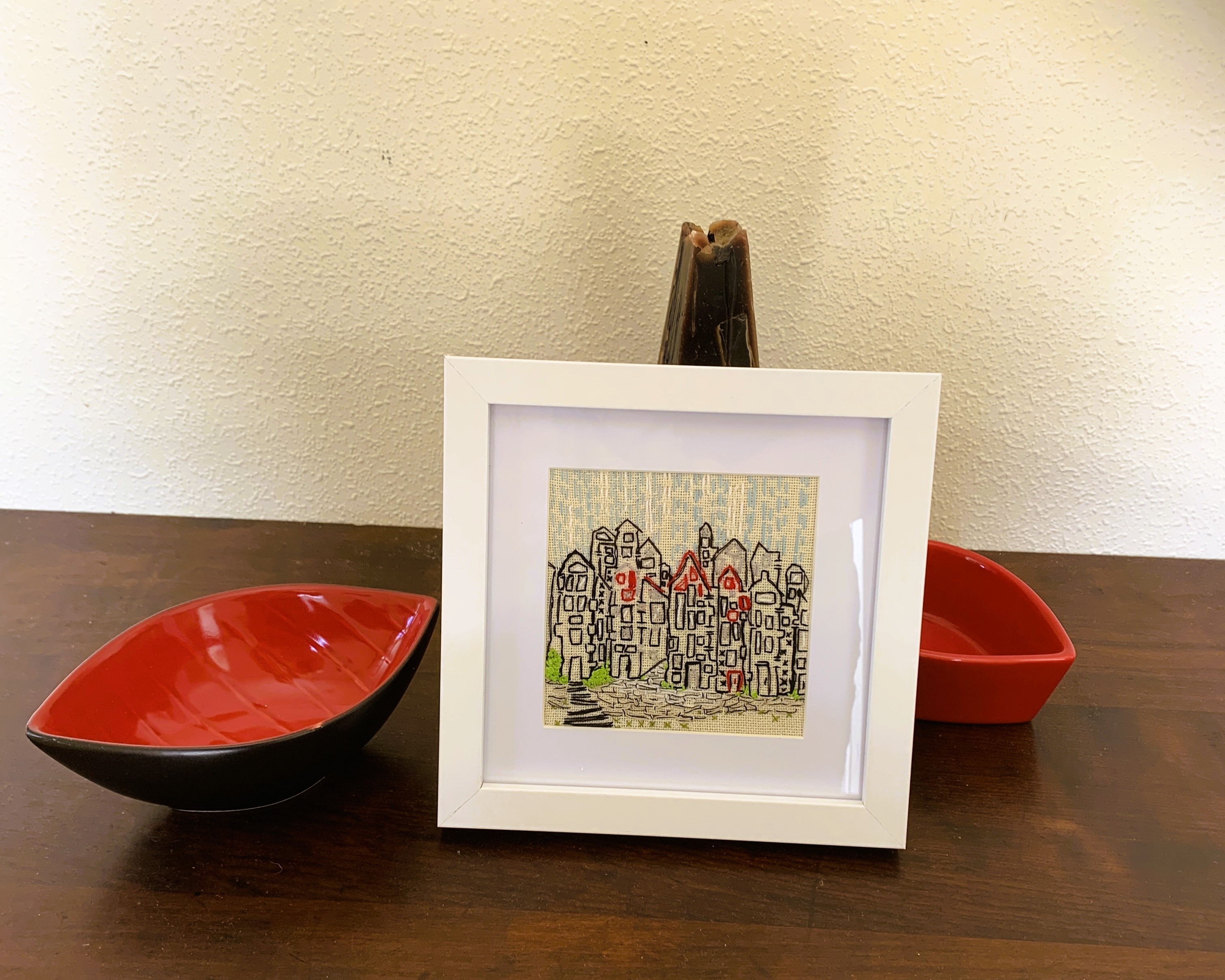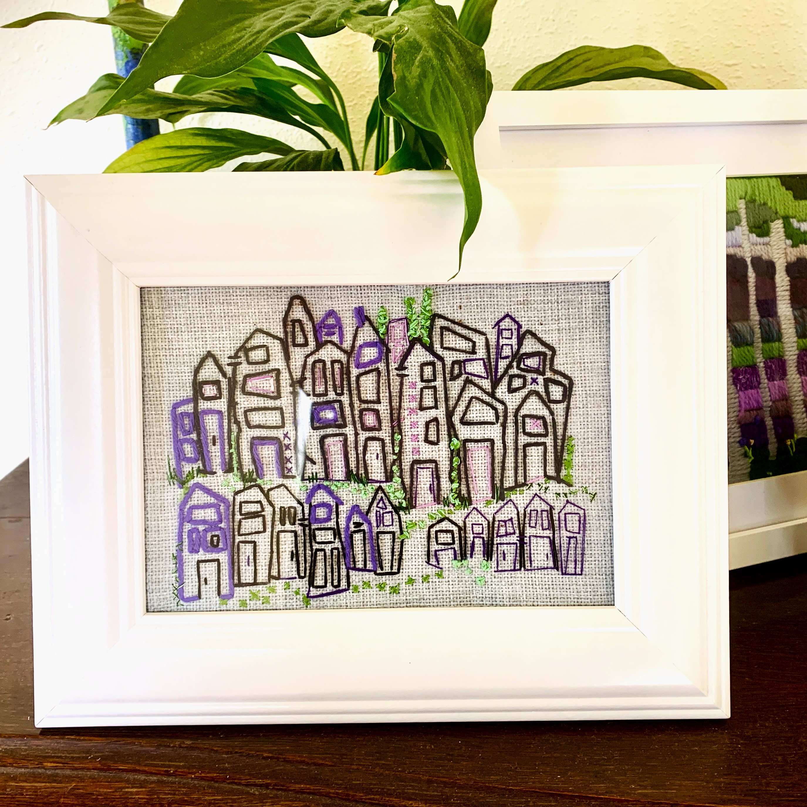 I’m also rather pleased with my quirky “Steampunk Village” using cogs and sprockets from my jewellery-making; it’s not for sale. “Terracotta and Blue Village” is a more traditional stitched tapestry, and I’ve finally finished and framed “Abstract City” which is stitched on tapestry fabric but with the canvas showing through. It features apartment buildings rather than village-style houses. Most of my stitched villages are tidy and symmetrical; I thought it would be fun to stitch a crooked village for a change, hence “Black and Purple Crooked Village”.