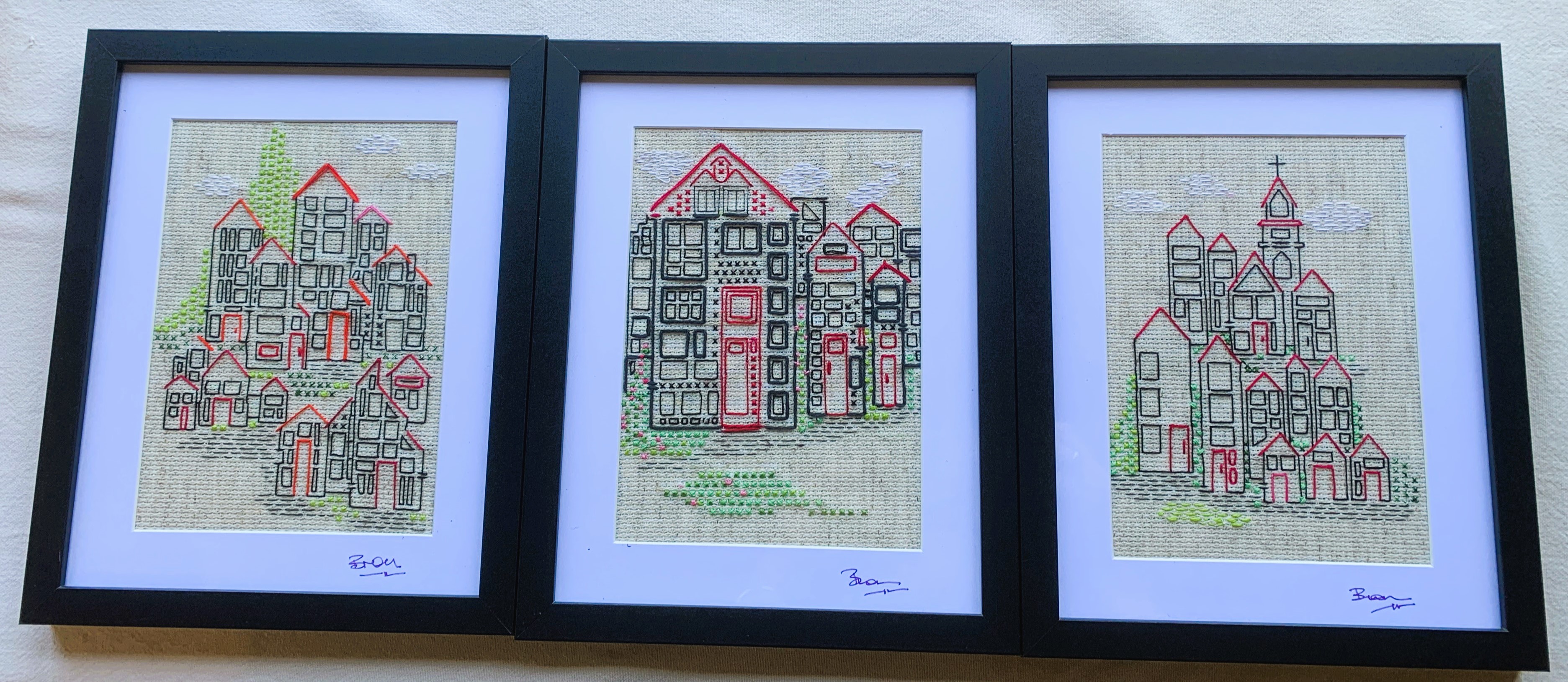 Below is my latest November 2024 “Black and Red Village Triptych”. The middle one was worked with thicker black cotton and stands out a bit; one of these days I might replace it with another fine-threaded one.
