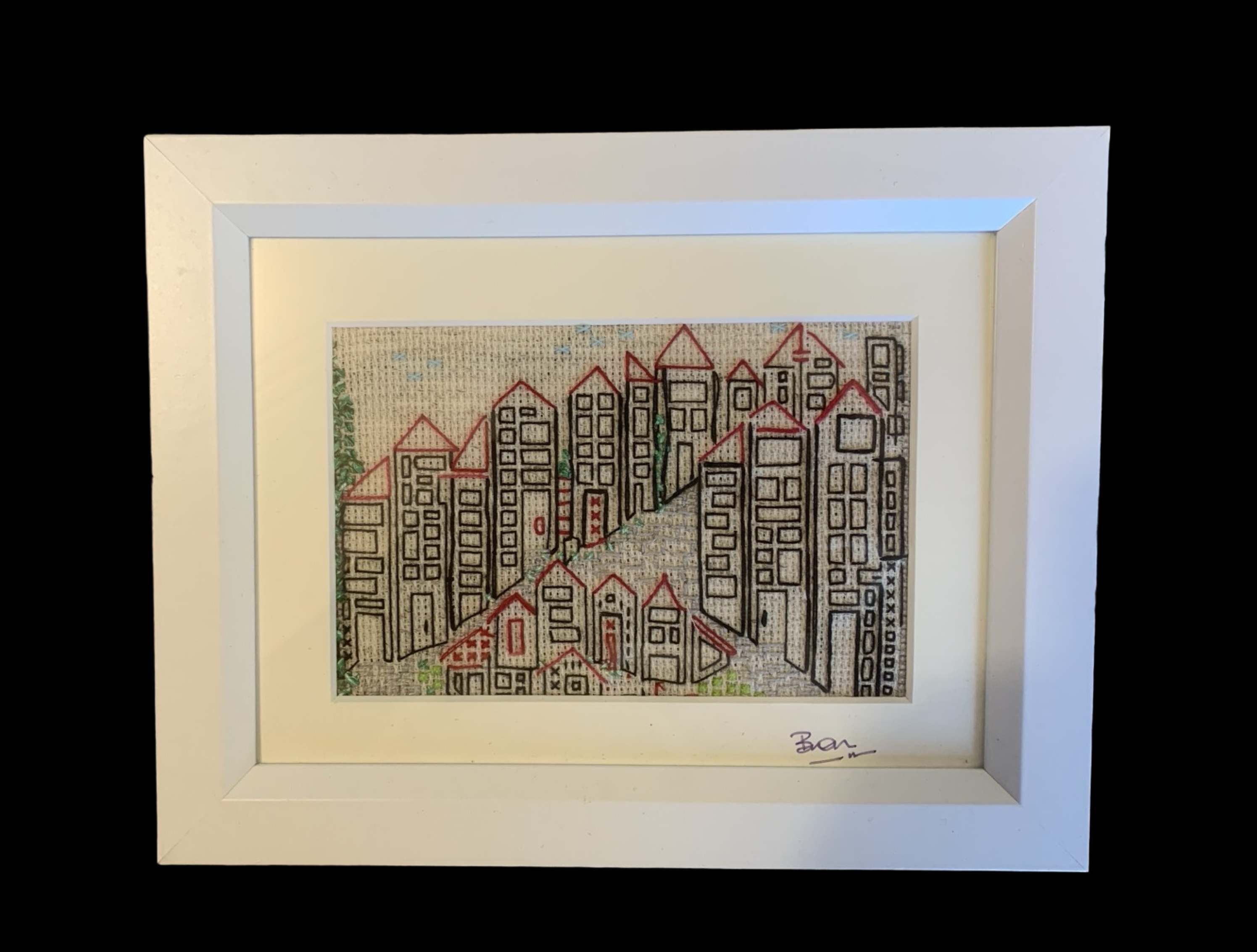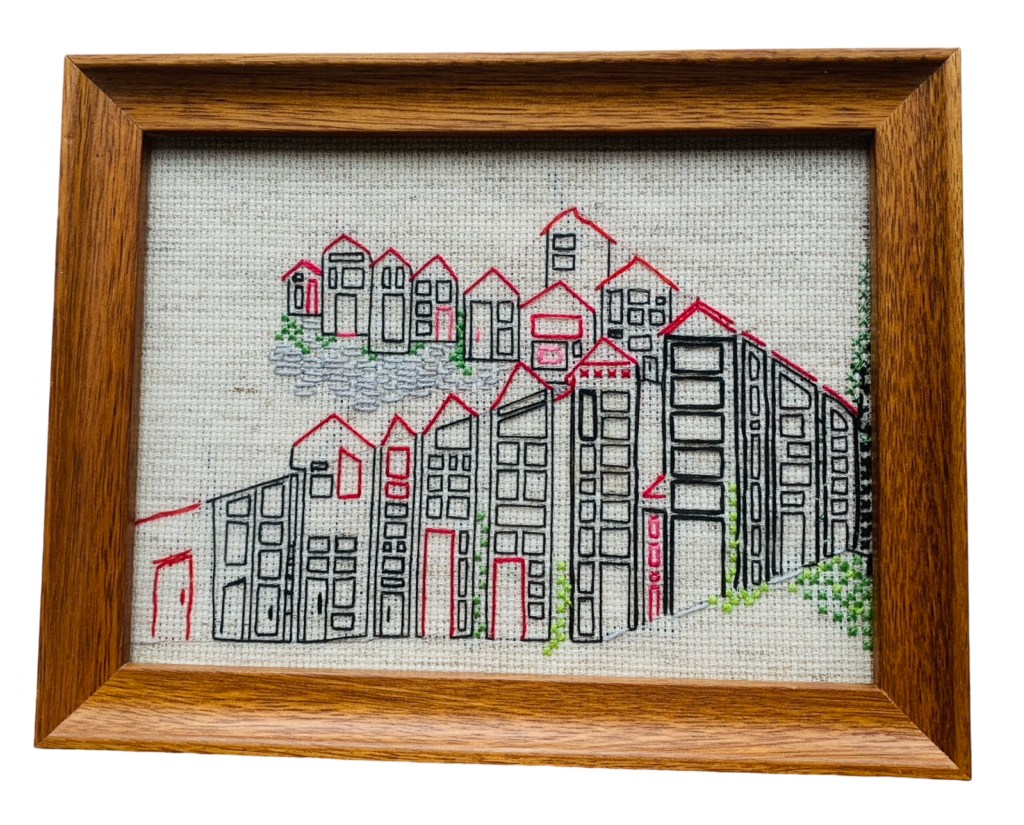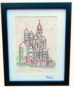 A new range from late 2023 when I was trying out different fabrics to stitch on, rather than tapestry canvas. A gallery of all my quirky villages is at the end of this page – scroll down to see them all. You can read about Quirky villages supporting Women’s Refuge in my recent post.