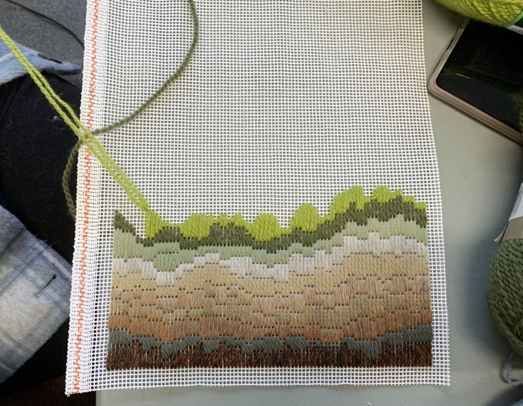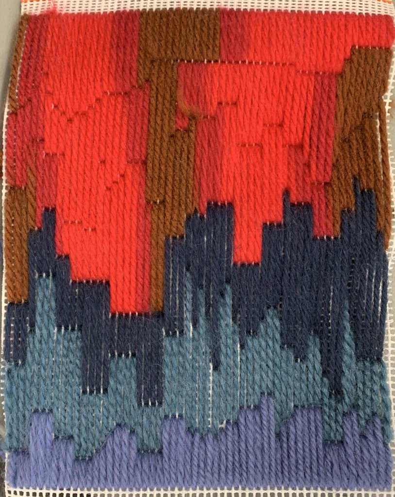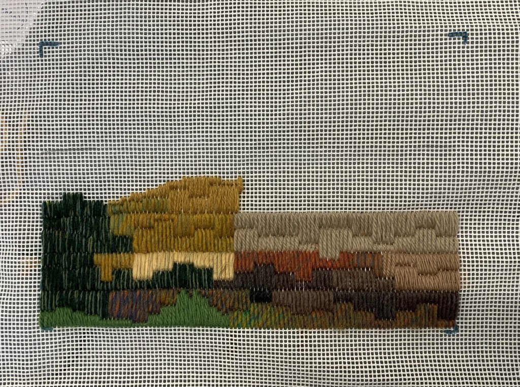 Six of us gathered for a day of stiching, sharing, learning and laughter. Participants’ experience in embroidery and in long-stitching was varied, some working from an image they wished to reinterpret in stitches, others simply starting from the bottom of the canvas and stitching until they saw what happened – a method I frequently use to create stitched surprises.
